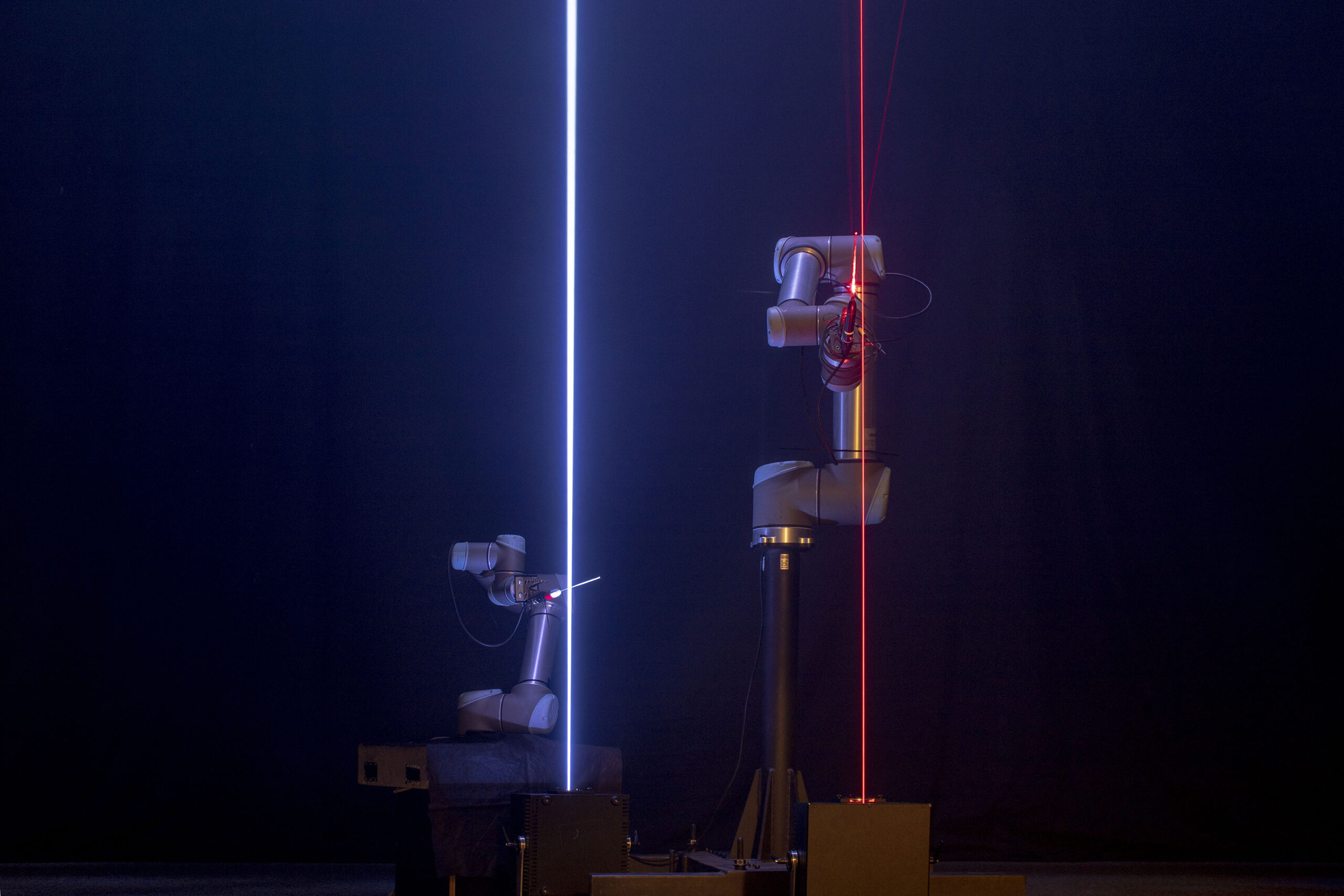Dvě robotická ramena UR5 a UR10 ovládají unikátní bezkontaktní nástroj Laser String. Už žádný lidský hráč – strojová přesnost robotů vytváří dokonalé načasování, díky kterému se subtilní laserový paprsek mění v hudební nástroj i vizuální zážitek.