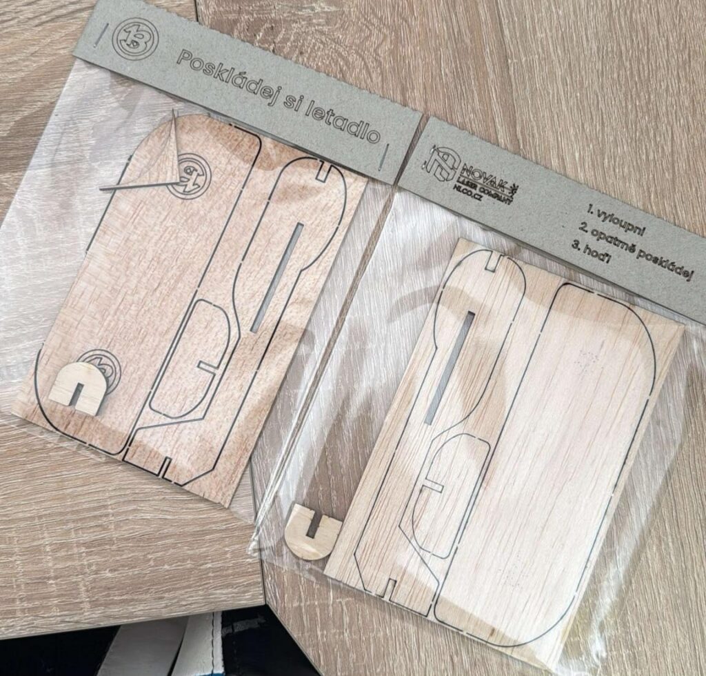 Z kvalitní překližky jsou pomocí laserového řezání vytvořeny jednotlivé díly dřevěného letadélka, které jsou navrženy tak, aby na sebe přesně navazovaly a umožňovaly jednoduché a intuitivní složení bez nutnosti lepení či speciálního nářadí.